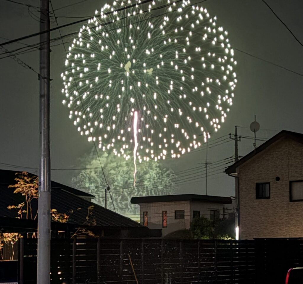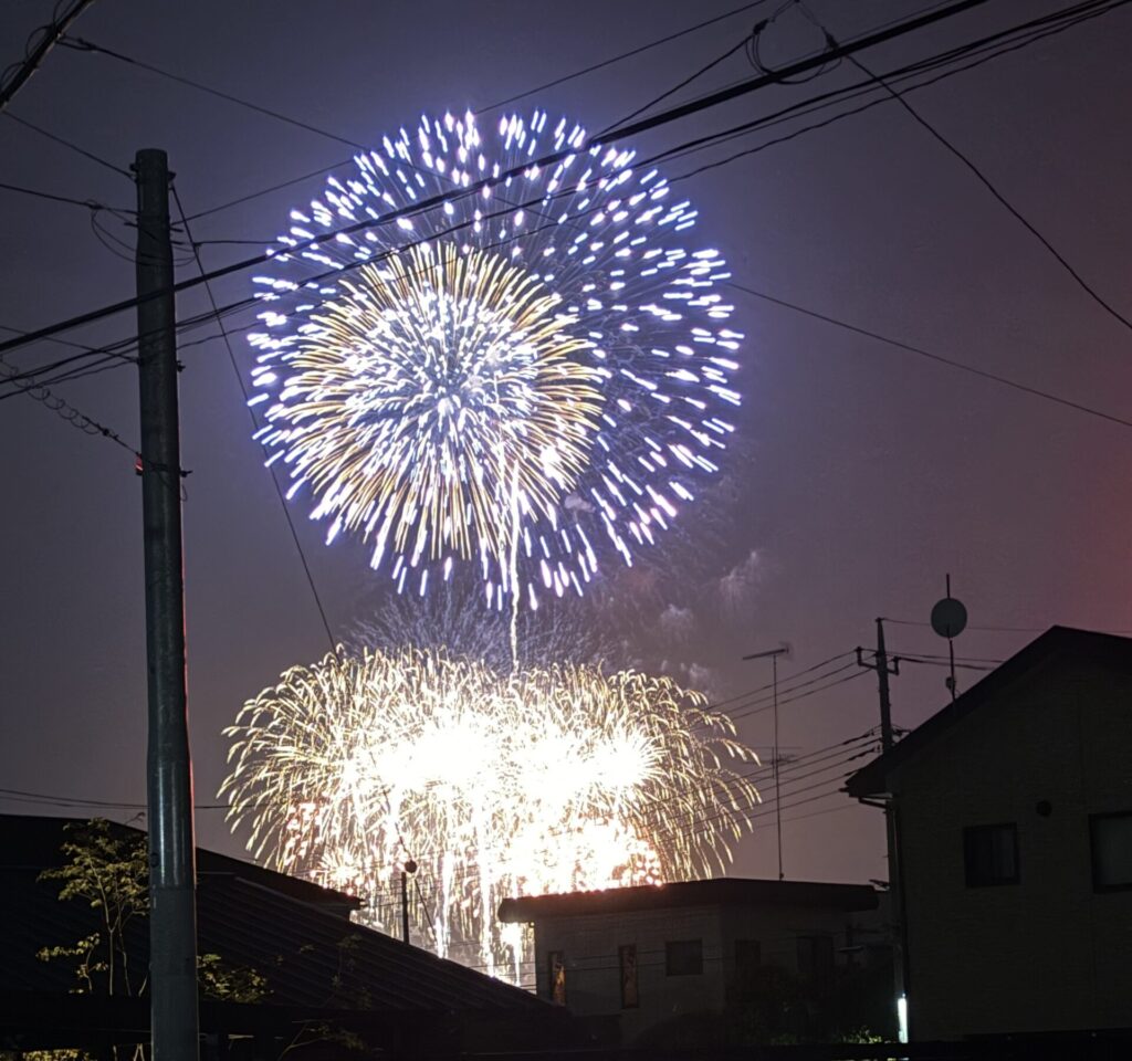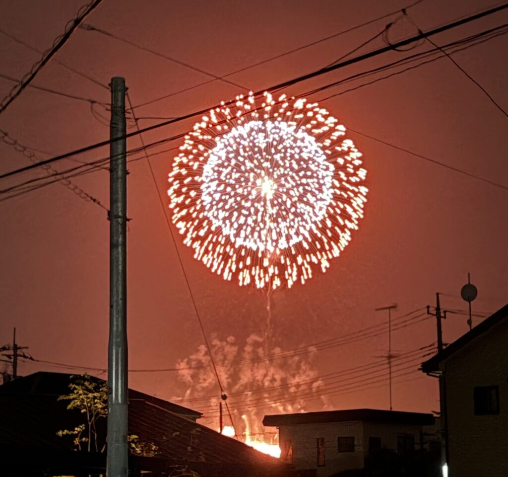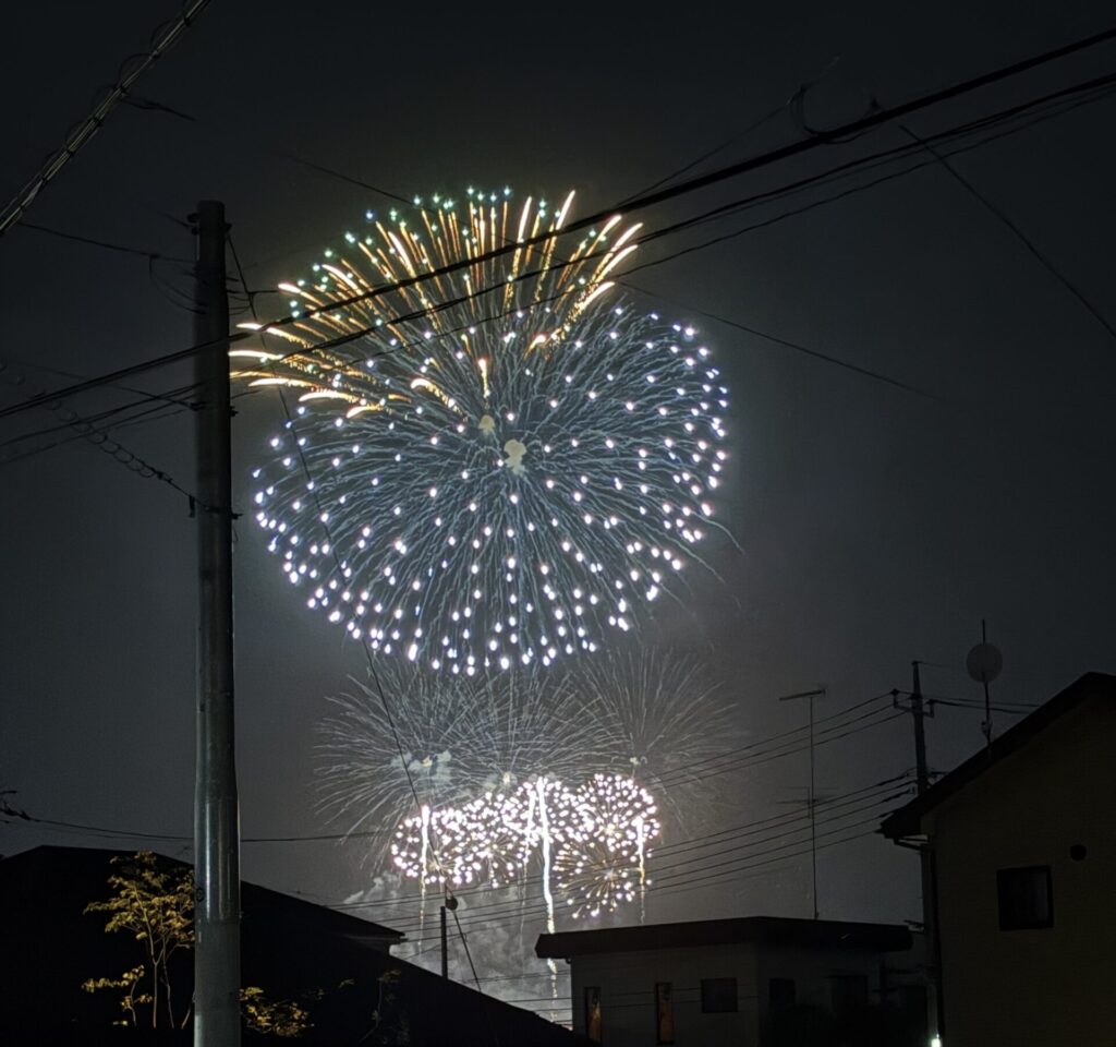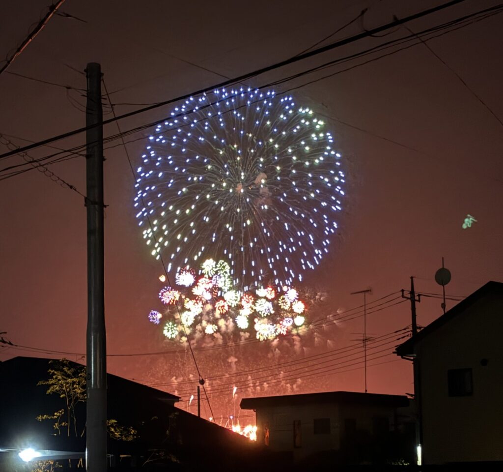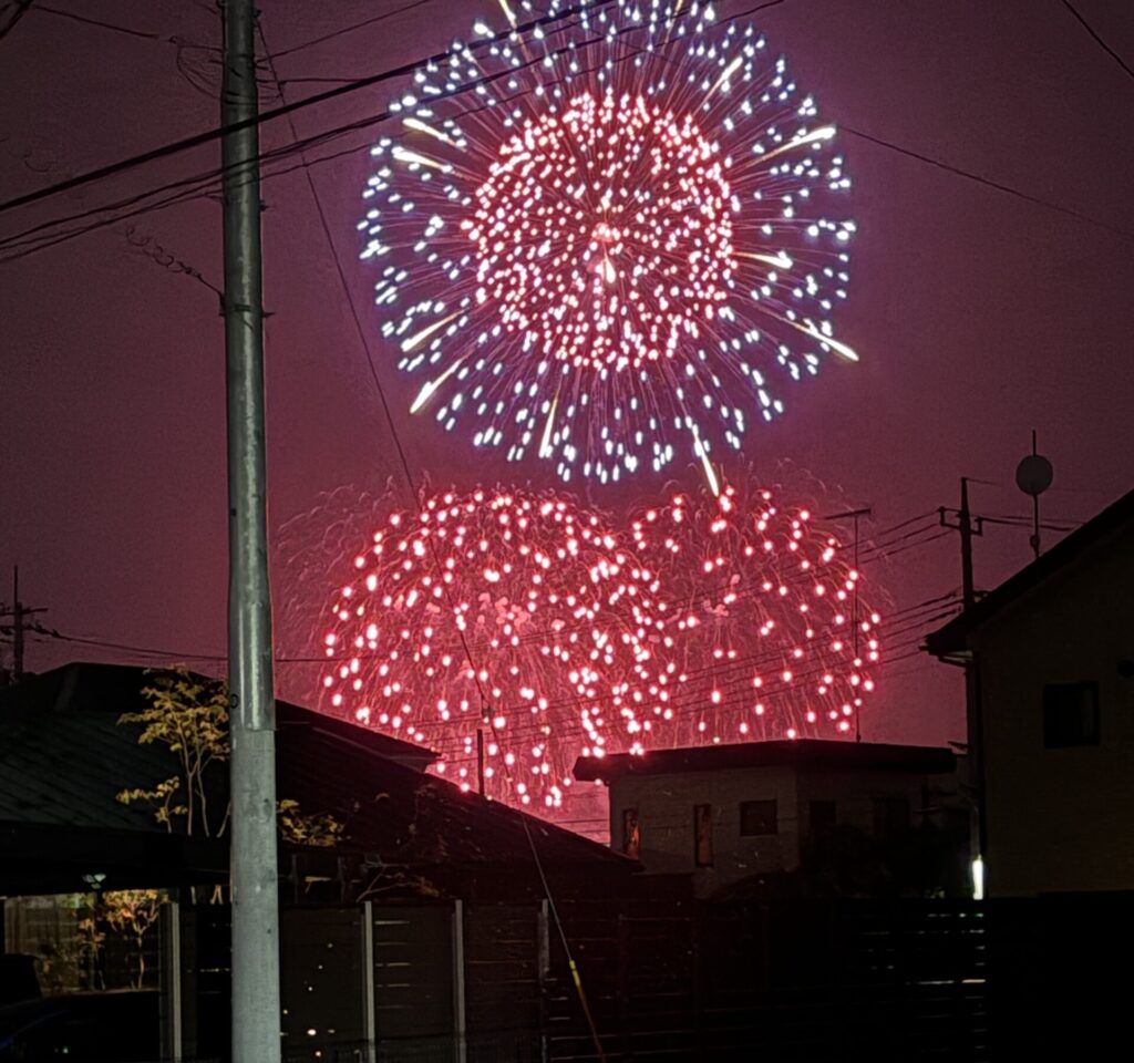 会場までは行けませんでしたが、家々の屋根の間から時折見える大きな花火が夜空を照らし、そのたびに「おおっ」と心の中で声を上げてしまいました。秋の空気は澄んでいて、花火の色もくっきりと見え、遠くにいても十分に迫力を感じます。音の響きとともに、近所の方々が外に出て同じ方向を見上げている姿もあり、地域全体で花火を楽しんでいるような一体感があり、とても和やか時間でした。
